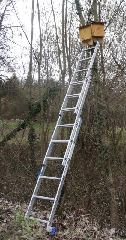 Heute war ich also dort um Vorbereitungen zu treffen, Leiter anstellen und so. Zunächst wollte ich noch ein Seil höher am Baum über eine Astgabel bringen. Ich bin ein kleiner Robin Hood und so habe ich den Bogen gespannt, an einem alten Pfeil eine dünne Maurerschnur befestigt und probiert ob der Pfeil trotzdem fliegt. Flog. Beim ersten Versuch habe ich durch die Astgabel getroffen und konnte jenseits des Baumes das Seil weiter runter ziehen. Dann gesehen dass es noch durch eine andere Gabel muss. Also auch nochmal zurückgeschossen. Super. Jetzt an der dünnen Schnur das Seil hochziehen. Das klemmte, deshalb erst mal eine etwas dickere dünne Leine nehmen, das ging. Mitten drin kam dann der Lieblingsnachbar und war schon auf der Leiter ehe ich möööp sagen konnte. ;D