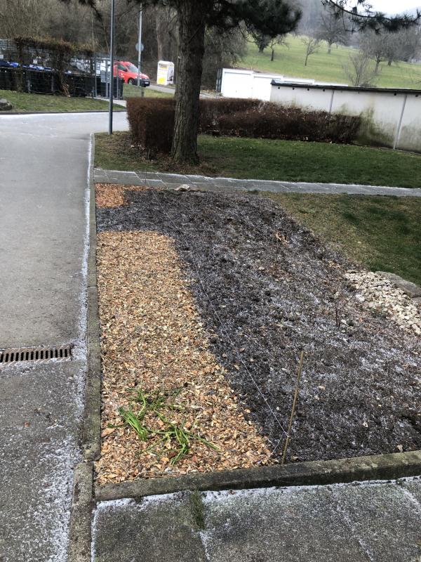 Gestern habe ich an stark bepinkelte Stelle die Erde ca. 30cm tief ausgetauscht. Die frische Erde habe ich vom Kompostplatz geholt. Der dadurch entstandene Loch habe ich mit uringetränkte Erde befüllt. Die ehemalige „Rasen“Fläche habe ich umgegraben und Wurzelkräuter entfernt.