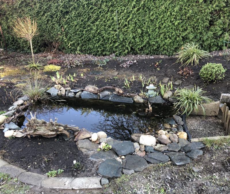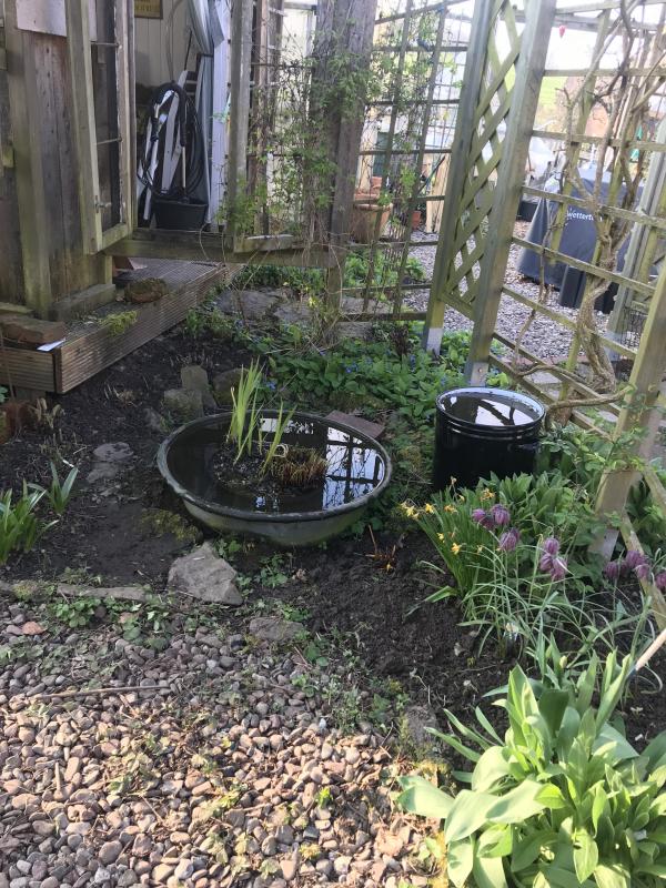 „Teich“Bereich gesäubert und entkrautet. Den Pott leer gemacht und mit frischem Regenwasser geflutet. Jetzt muss ich mir überlegen, wie ich die Wasserpflanzen im Pott anordnen will. Ein Teil der für diese Ecke vorgesehenen Pflanzen eingesetzt.