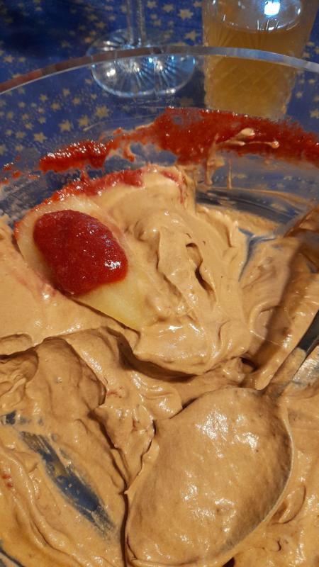 Filetmedaillons, Rahmchampignons mit Gorgonzola und grünem Pfeffer, dazu Kroketten und Herzoginkartoffeln. Immerhin habe ich noch dran gedacht, dass Dessert zu fotografieren - Glühweinbirne mit Eierlikörmousse und Vanilleeis.