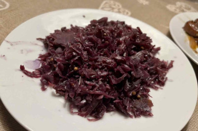 Kalbsleber alla Veneziana, mariniert in Sojasoße und gebraten auf Schalotten mit etwas Knoblauch, gewürzt mit Rosmarin und Majoran und abgelöscht mit Sherry, sowie Blaukraut gedämpft und gewürzt mit Ingwer, Sternanis, Koriander und Zimt zum Amarone di Valpolicella 2014 aus Negrar im Valpolicella bei Verona.