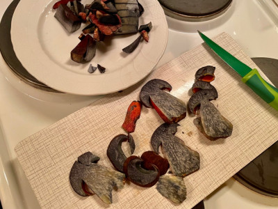 alles selbstgefangen: ich kenne diese hexenpilze in niedersachsen schon seit vielen jahren, wenn ich in den pilzen war, hatte mich aber nie drangetraut. erst vor kurzem durfte ich nun gerade in sachsen eine pilzjagd begleiten, wo die rotblaubunten gesellen begeistert in rauen mengen zusammen mit steinpilzen in die körbe wanderten und mir wurde nachdrücklich ihre schmackhaftigkeit versichert. jetzt habe ich die gelegenheit genutzt!agarökonom hat geschrieben: ↑25. Okt 2024, 06:55 Diesen Hexenpilz habe ich noch nicht gesehen, eigener Fund oder gekauft ?
