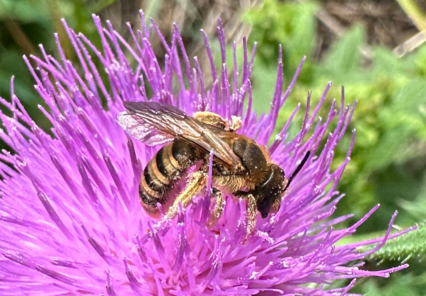 Die hat es auch geschafft, besiedelte Bereiche zu nutzen, ihre Nester sehe ich auf einer gemähten Verkehrsinsel und bei Rasensteinen. Leicht zu finden, weil sie gesellig lebt, zu gewissen Tageszeiten und Sonnenständen ist dann viel Flug.
