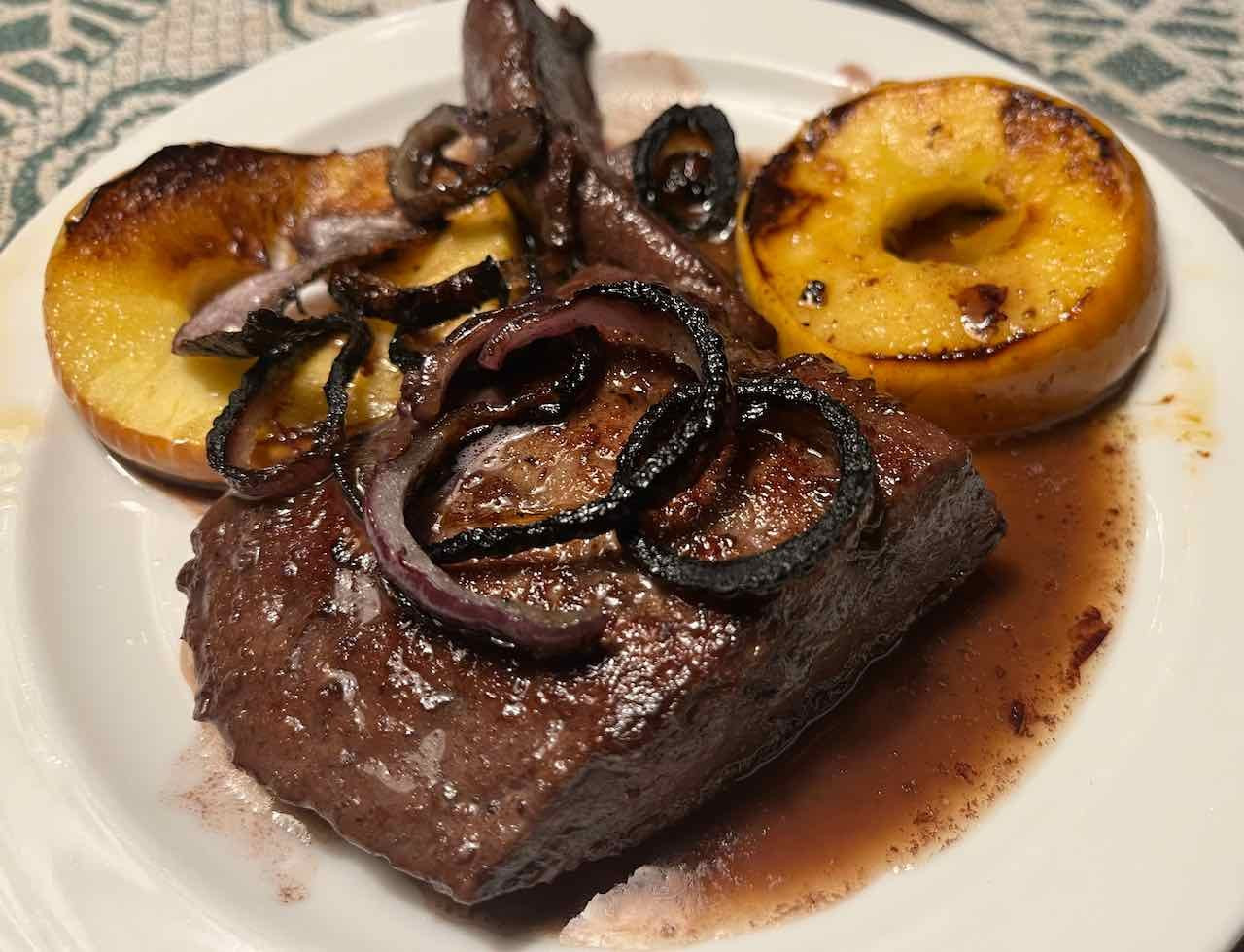 Kalbsleber Berliner Art mit Apfelringen, roter Zwiebel und Olivenöl-Buttersoße, mit Rotwein abgelöscht zum "Le Manoir" 2022