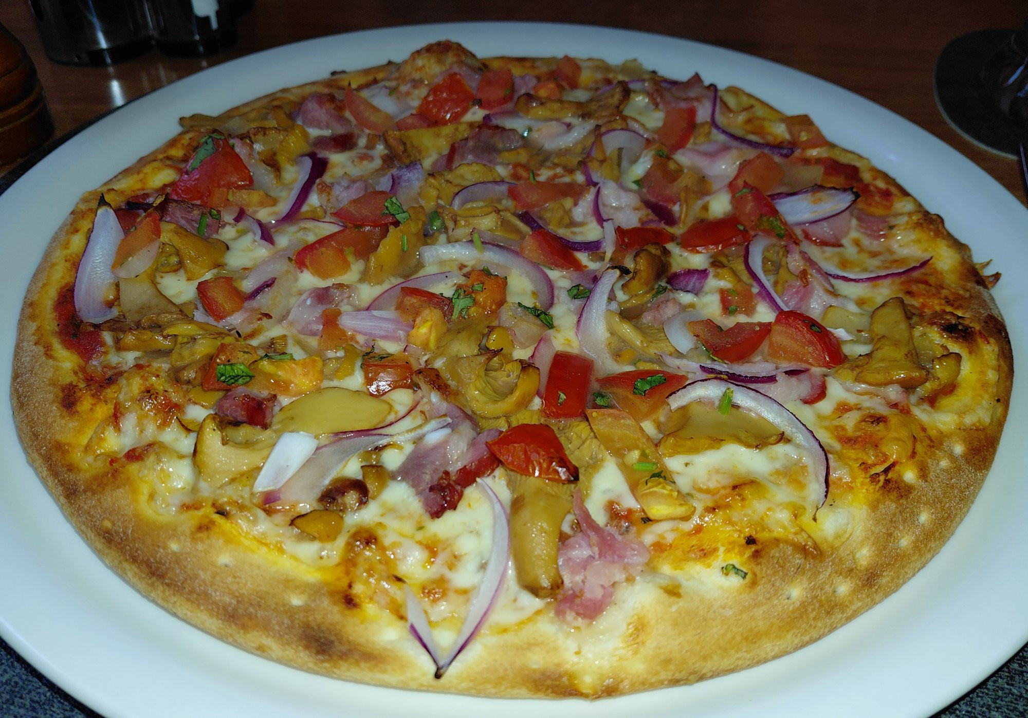 Pizza mit Pfifferlingen und Zwiebeln. Dummerweise hatte ich vergessen, den Speck abzubestellen.