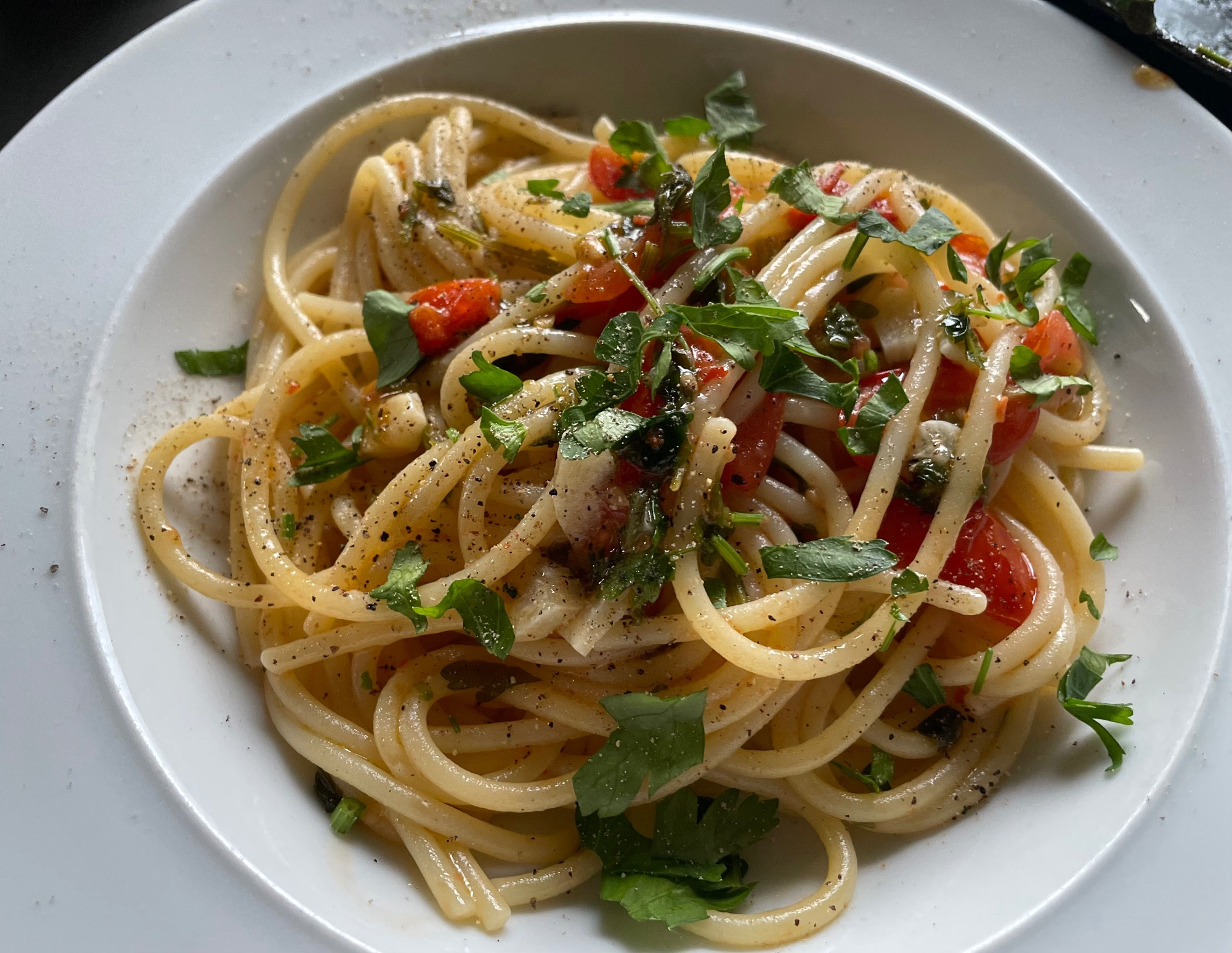 Bei uns gab es heute Spaghetti aglio, olio e peperoncino.