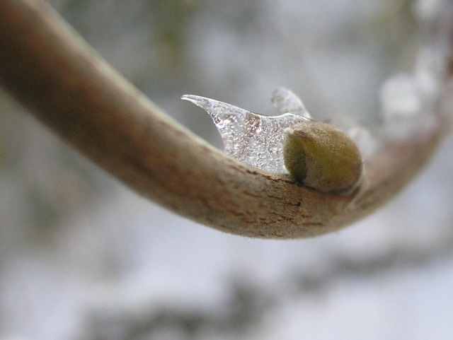 war heute der Sonenaufgang hierund die Wisterienknospe schaukelte in einer Wiege aus Eis