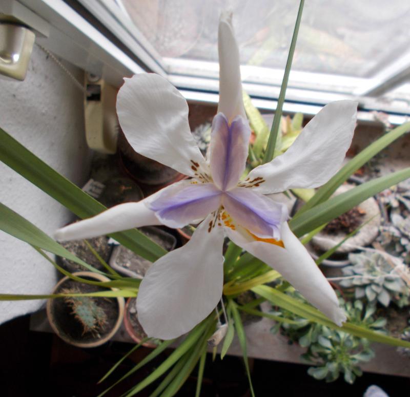 Keine Zwiebelpflanze, aber schutzbedürftig und unter „& Co“ fallend: Dietes grandiflora – ein kurzes Vergnügen: vormittags aufblühend und am Abend des Folgetages schon wieder verblüht. Aber hübsch isse :D