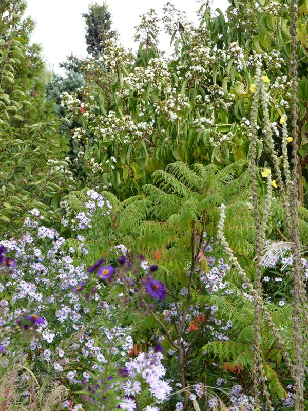 Der Heptacodium ist in Vollblüte und duftet das ganze Gartenareal ein. Davor wird in Kürze der Essigbaum für Farbe sorgen.