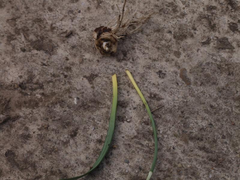 Heute habe ich leider feststellen müssen, dass die Mäuse tatsächlich auch Schneeglöckchenzwiebeln annagen. Als Laub und Blütentrieb immer welker erschienen, habe ich vorsichtig daran gezupft. Beides kam mir entgegen, und bei tiefem Nachgraben fand sich außer Mäusegängen auch die Zwiebel.