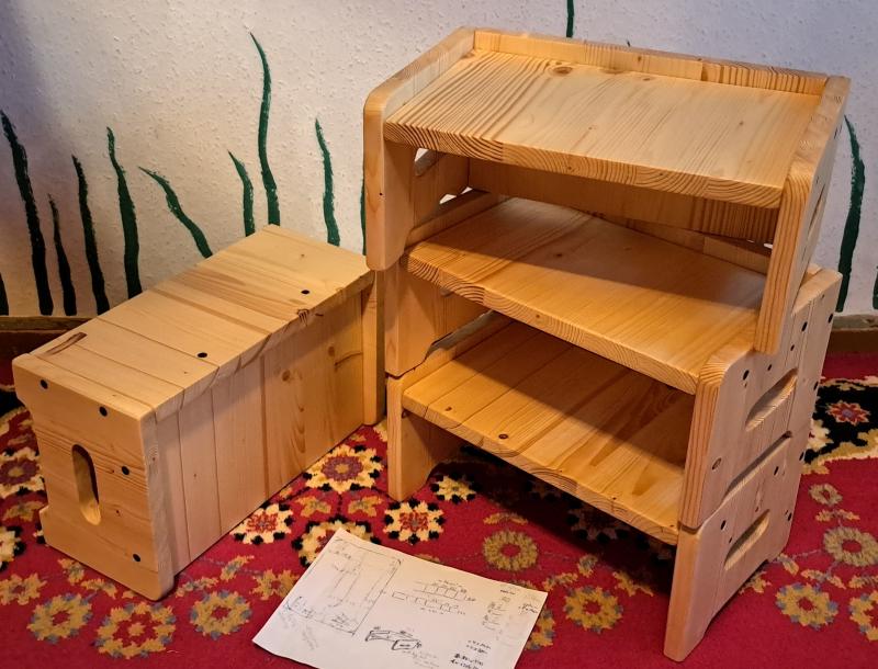 Ich hatte Fichtenleimholz (ist relativ leicht - wichtig, damit Kleinstkinder die auch rumtragen können) mit Stichsäge ausgesägt, geschliffen, vorgebohrt, mit je 10 Schrauben geschraubt, Ungenauigkeiten nachgeschliffen und angepasst, mit Osmo Hartwachsöl gestrichen, lange :P trocknen lassen. Sitzhöhe ist 14 cm. Aber natürlich variabel 8).