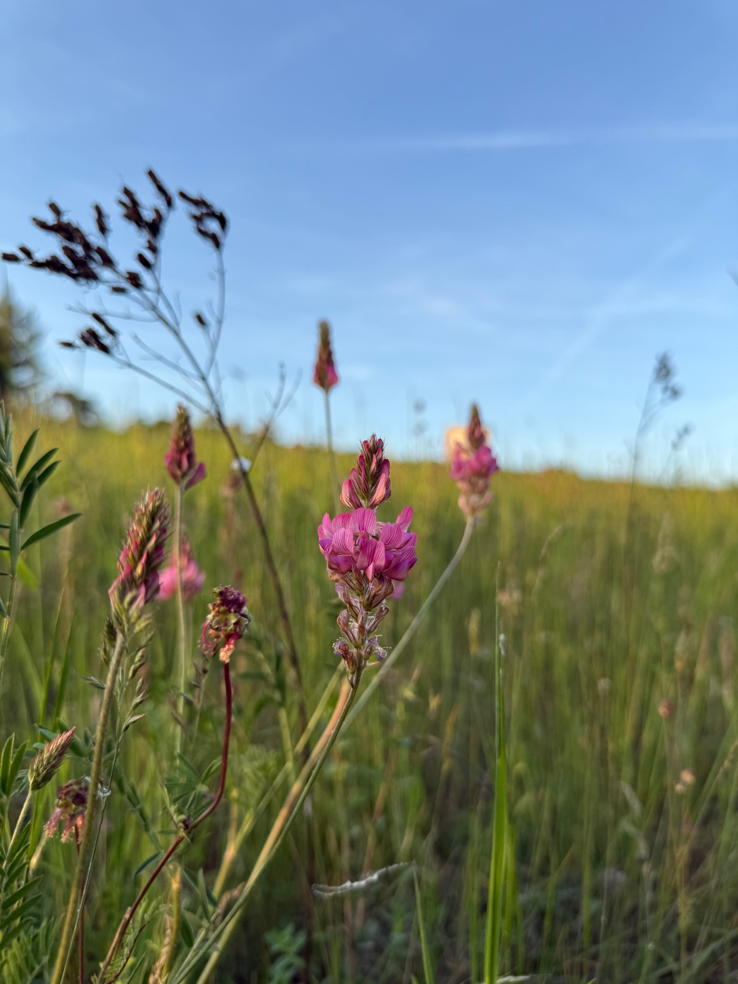 ein großer Bibernell Rosen Strauch auf einem sonnigen mageren Standort , am selben Standort die Esparsette: