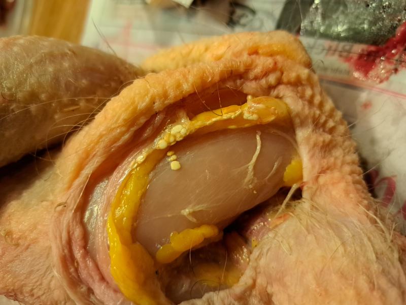 2. Beim Ausnehmen fand ich diese ... Dinger ... neben dem Kropf, in dem Häutchen zwischen Haut und Fleisch. Sonst fiel mir sowas nirgendwo auf und ich hatte solche Flecken noch nie am Schlachthuhn gesehen. Was ist das? Unbedenklich? Sieht für mich nach linsenförmigen Fettstücken aus ... man kann sie mit dem Fingernagel zerdrücken, aber nicht so leicht.