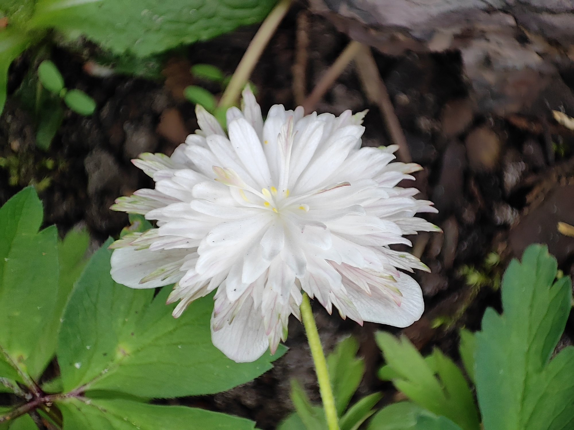 Irgendwie scheinen sich die Buschwindröschen im Zweitgarten selbstständig zu machen. Dabei tauchen interessante Formen auf, wie dieses, direkt neben einem vom Typ 'Edgar'. Auf der Rückseite ist es jetzt, schon etwas älter, rosa überhaucht.