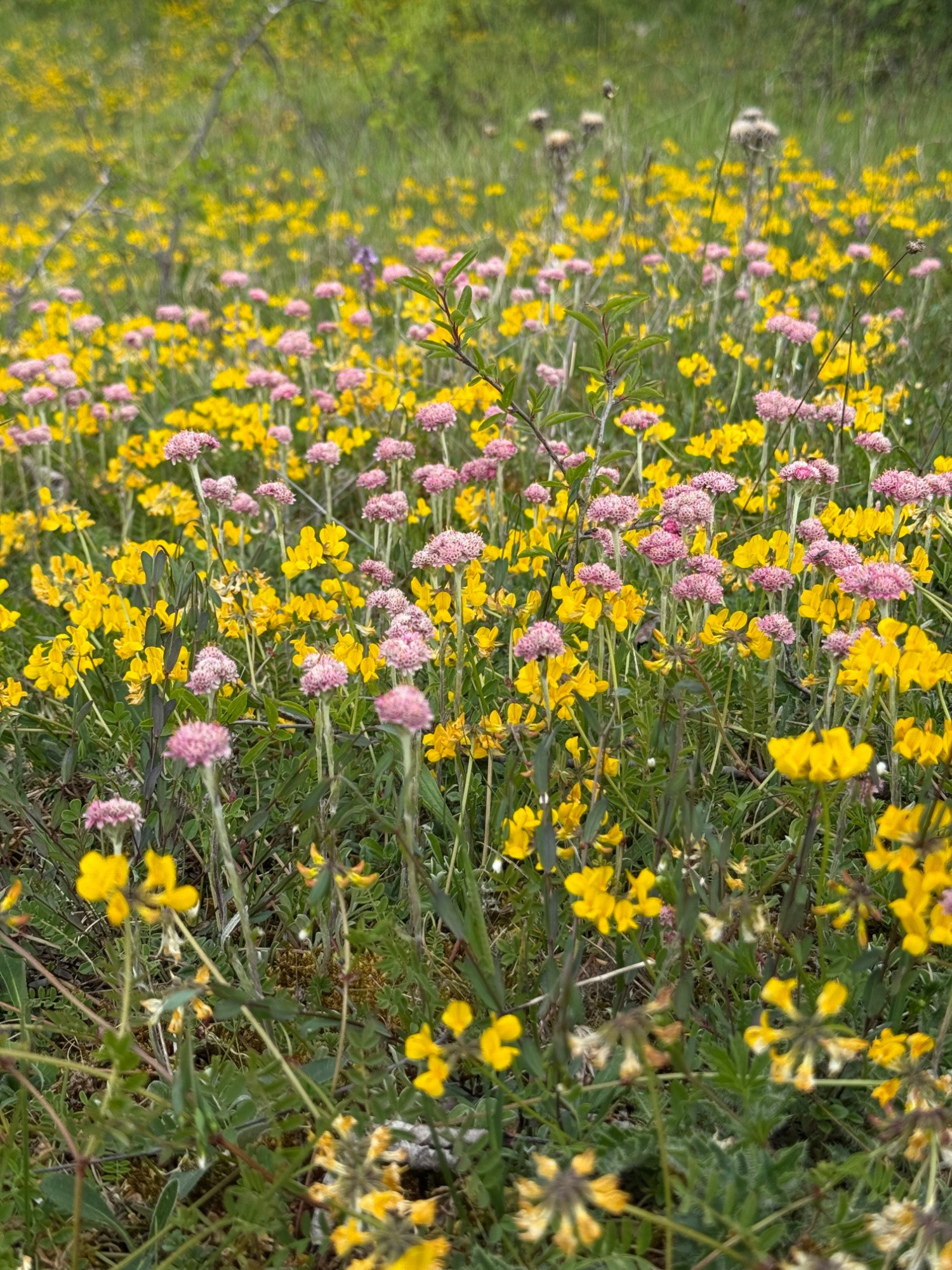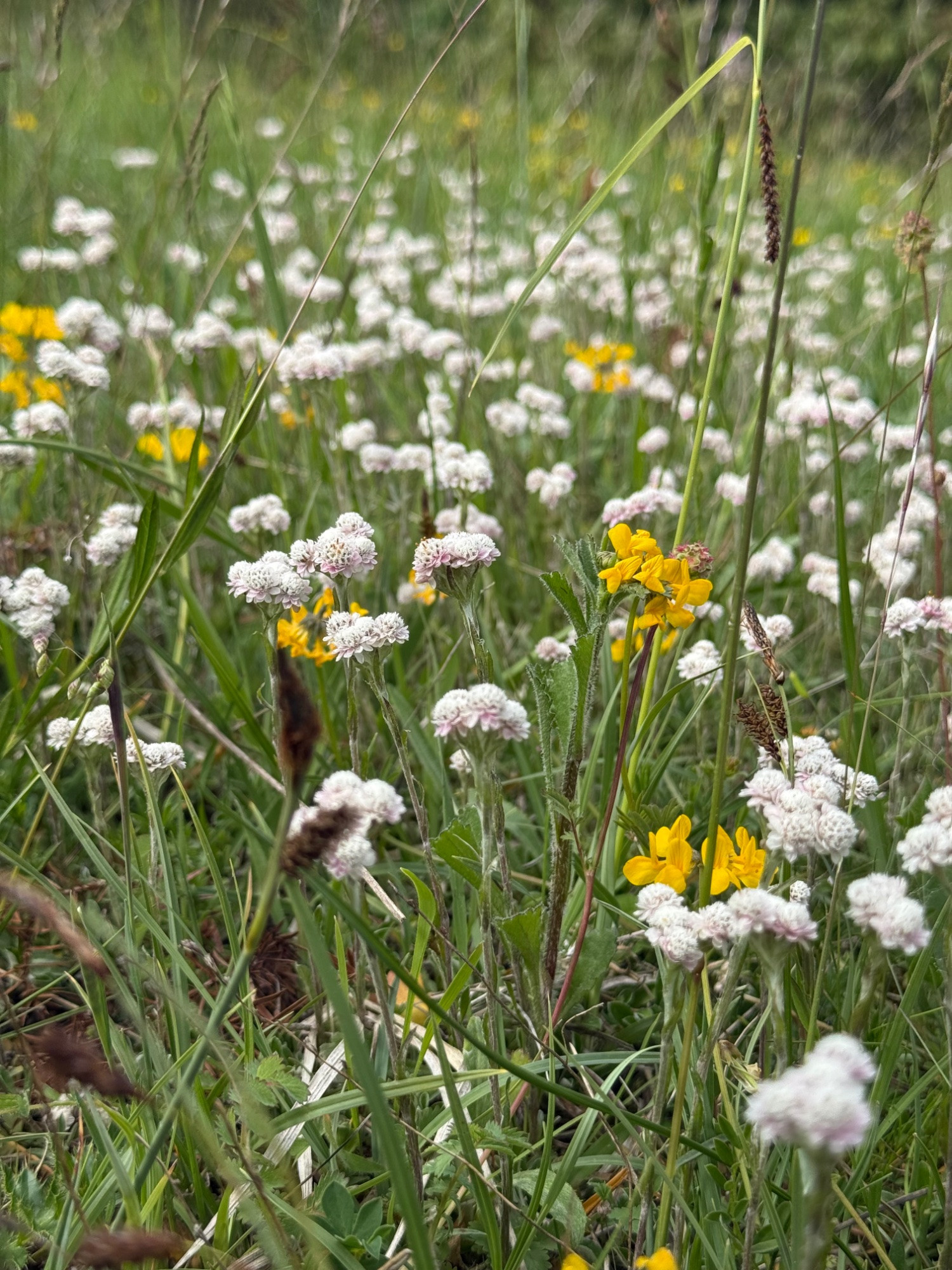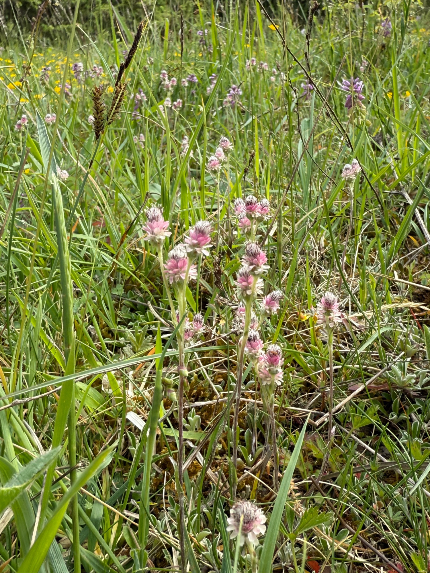 Das Hasenpfötchen, Antennaria Dioca sehr viel gestaltig am Naturstandort von fast rein weiß über rosa zu rotönen hier gemeinsam mit dem Hufeisenklee: