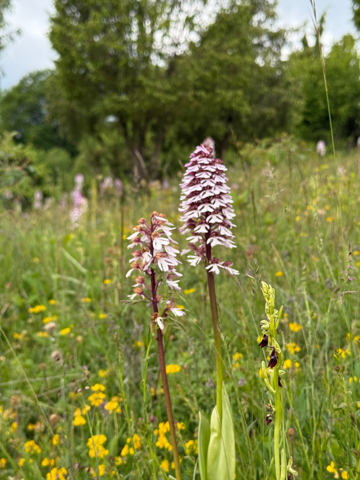 Eine weitere Detailaufnahme von Fliegen-Ragwurz, Helm-Knabenkraut und der noch nicht blühenden Mücken-Händelwurz.