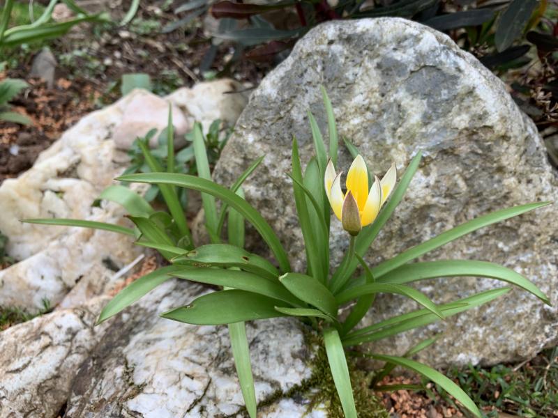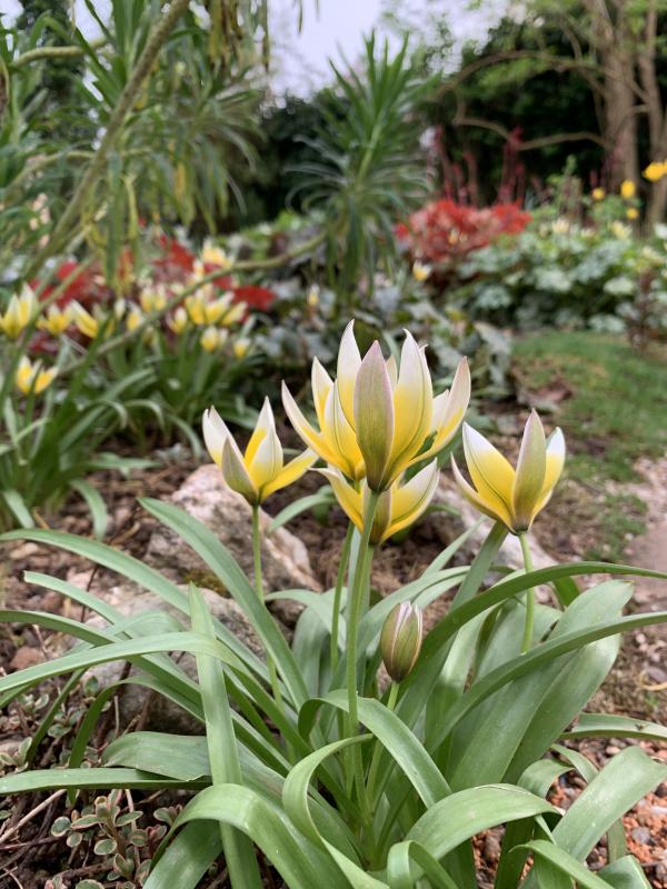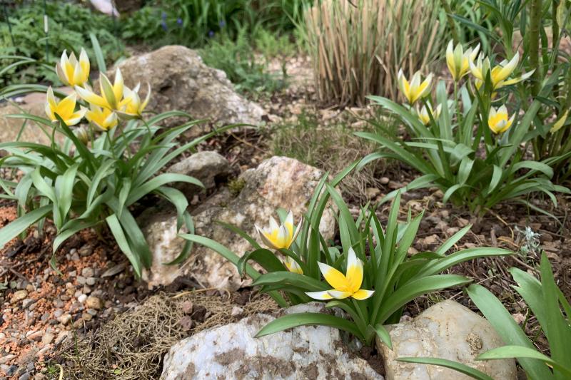 Im Kiesbeet blüht Tulipa tarda, in diesem nassen Jahr mit seltsam schmalen Blütenblättern. Im Hintergrund Weinbergstulpen