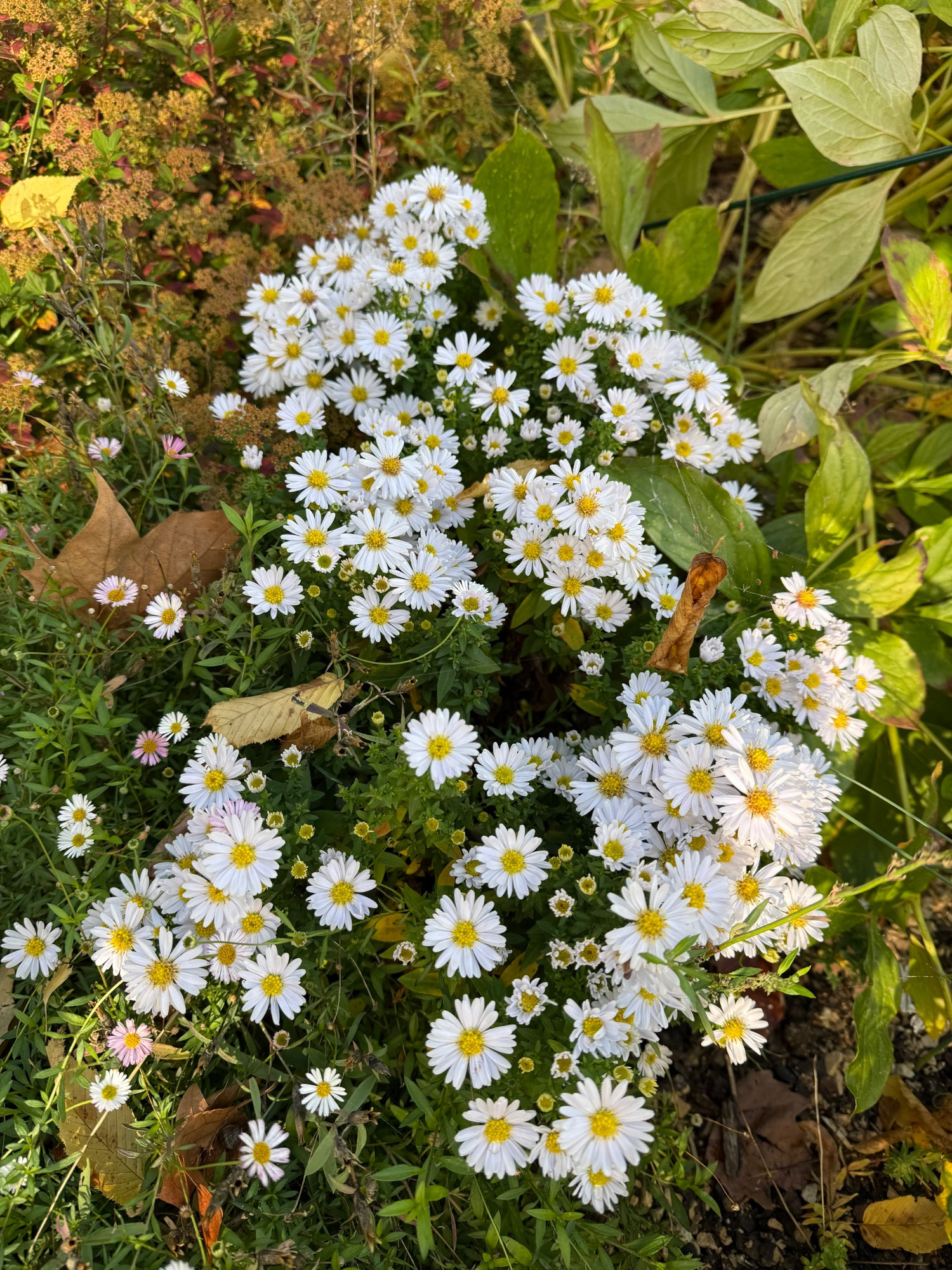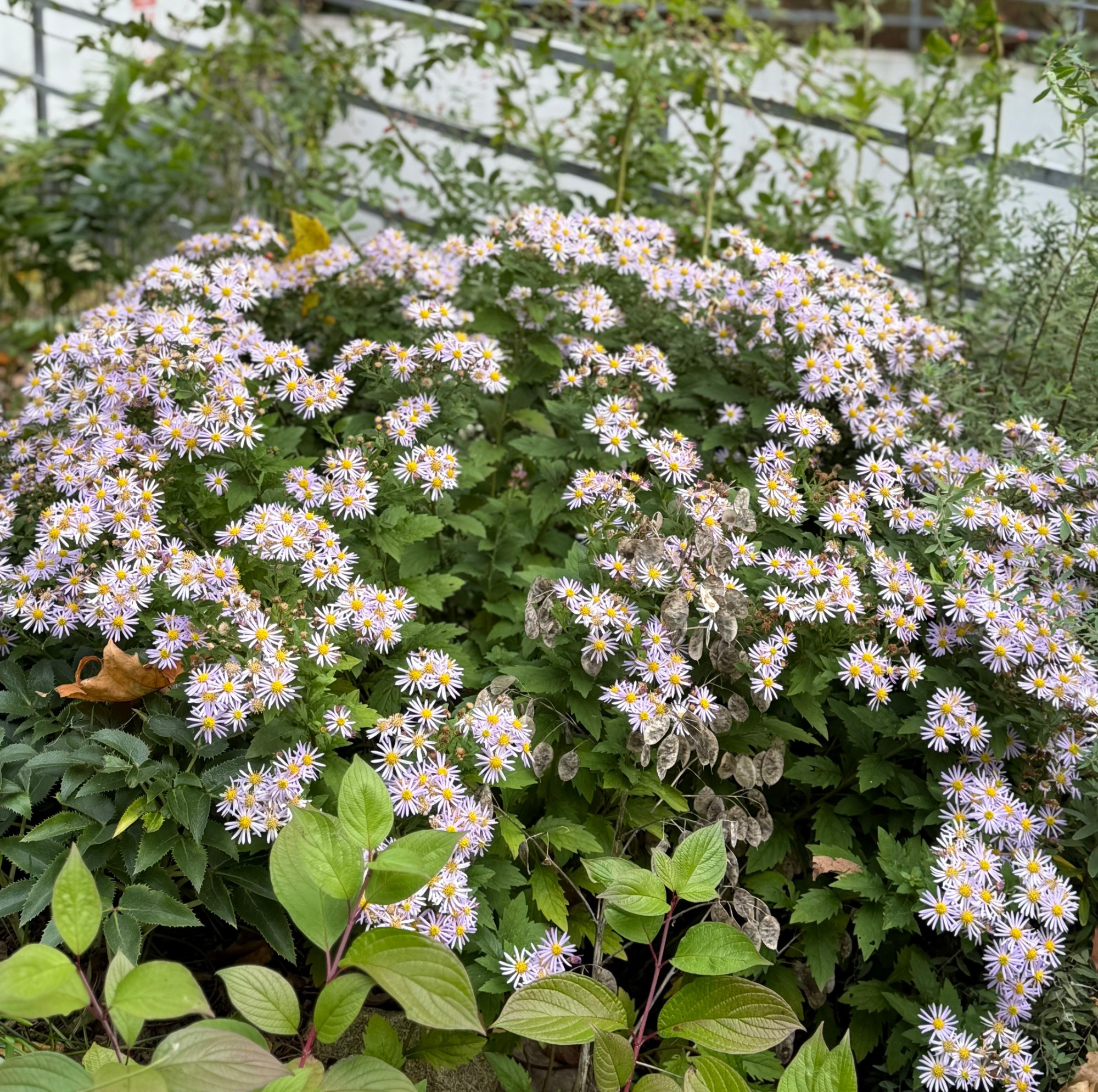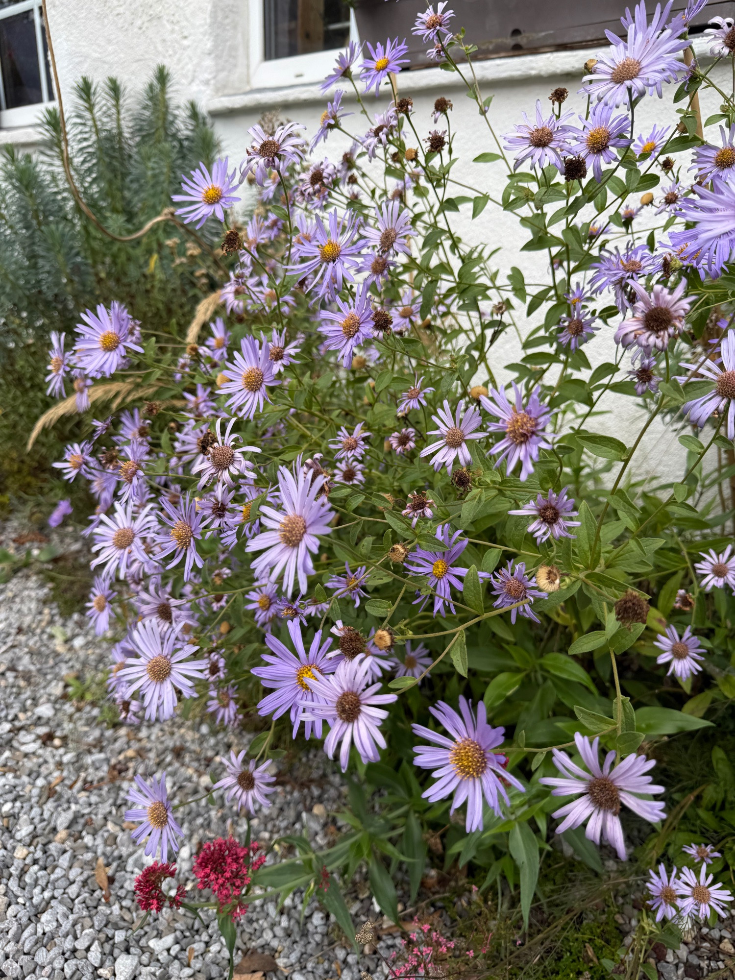 Im Vorgarten steht neben der wunderbar zarten Aster lateriflorus var. horizontalis eine mittelhohe Kissenaster, von der ich nicht genau weiß, ob es ein Sämling ist, oder ob ich irgendwann mal ein Mitbringsel eingepflanzt habe. Jedenfalls tauchte beim Roden des Beets letzten Herbst plötzlich ein ärmliches Stängelchen mit etwas Laub daran auf, ich pflanzte es wieder ein, und prompt sind dieses Jahr eine Handvoll kräftige Stängel mit einer reichen Blütenfülle gewachsen. Sie erschlägt mit ihrem Pomp ein wenig die zarte Aster, aber letztere wird sicher auch noch eine Weile blühen, wenn die andere schon wieder vergangen ist.