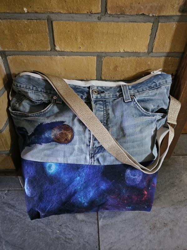Beim Holz kann ich nicht helfen und beim Norwegerpulli kann ich auch nur anerkennend staunen, ich kann leider nicht stricken. Dafür aber nähen und jetzt ist Papas alte Jeans eine neue Tasche für meine Tochter. Sie hat alle Stoffe ausgesucht und mit genäht.
