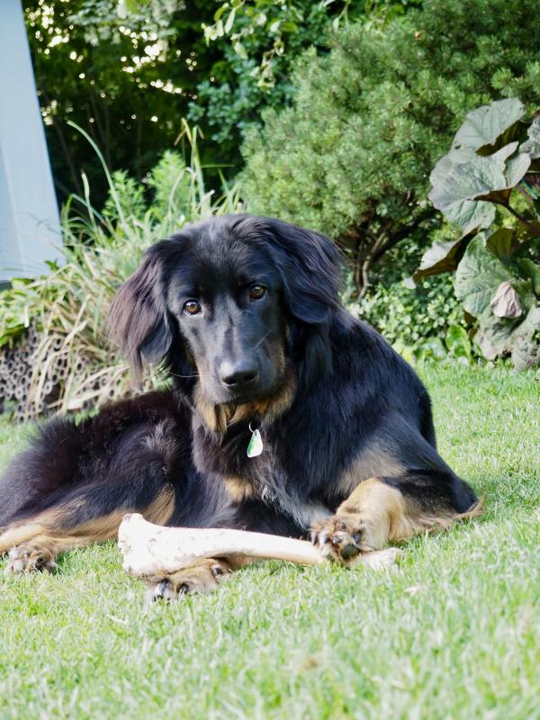 Tessie zerkaut zum hundertsten Mal ihren Uralt-Knochen. Ohne Hund war der Garten leer. Auch wenn sie ihren eigenen Kopf hat... frisch gepflanzte Stauden ausbuddelt und Knochen einbuddelt. Ich wundere mich oft, was ich bei meinen Grabearbeiten so finde.