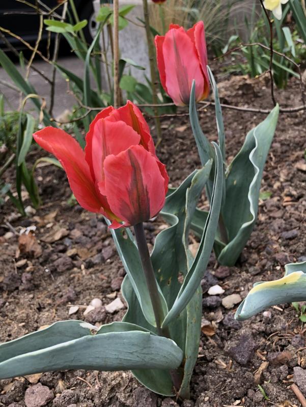 Bei uns kommt eine sehr zierliche, ich denke botanische Tulpe vielleicht habt ihr einen Namen.