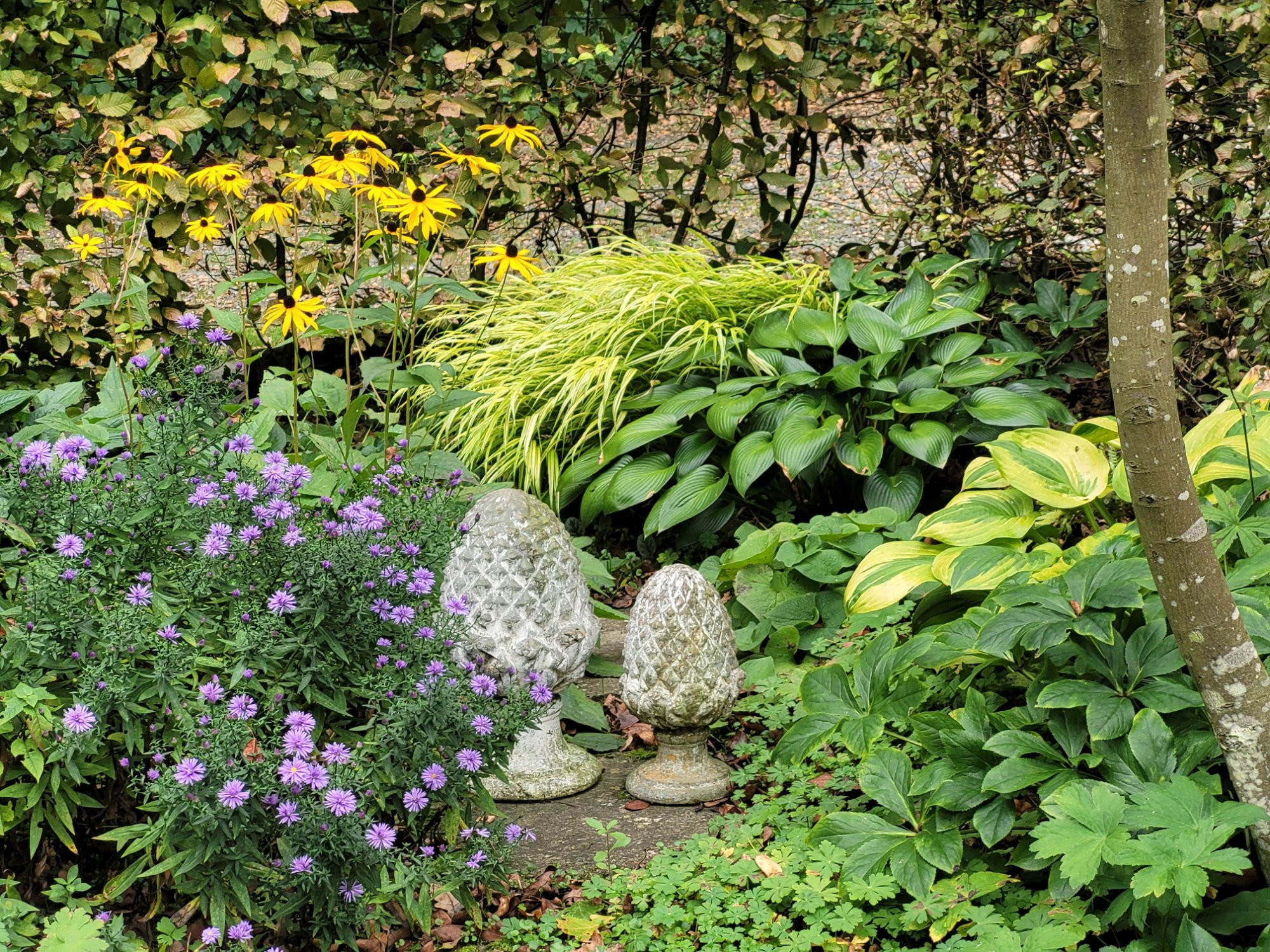 Sempervirens, Wunder von Stäffa würde ich ausprobieren wenn ich noch einen Platz für eine mittelhohe Aster frei hätte: Dieser Mini-Garten ist einfach schon viel zu voll.