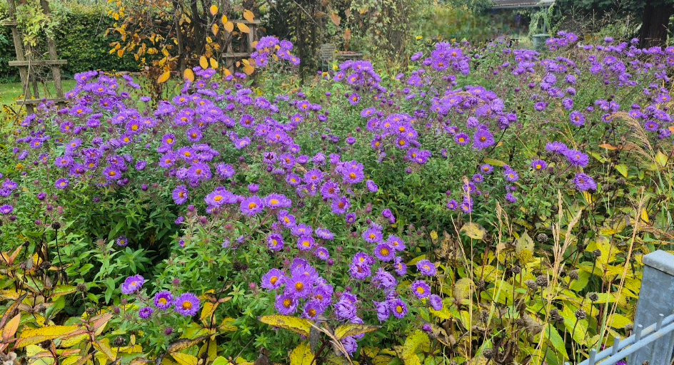Und noch die ordentlich stehenden Aster novae-angliae 'Barr's Blue', da hab ich vor 12 oder so Jahren mal 3-4 gepflanzt. Schön zum nun gelben Laub der Heliopsis.