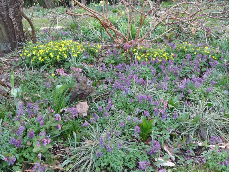 Die Corydalis bringen inzwischen auch Farbe in den Rasen an der Frühblüherwiese.