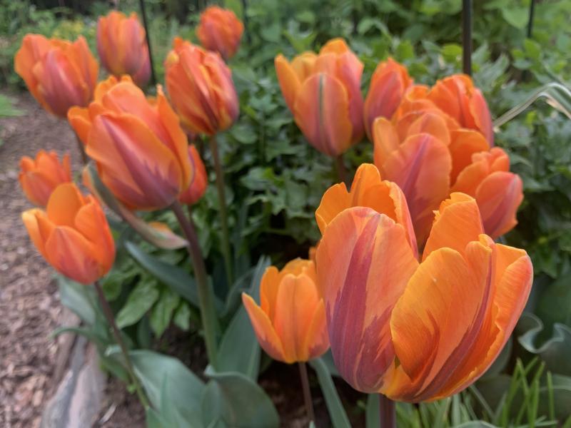 Prinses Irene blüht hier nun auch. Allerdings kommt es mir vor, als wäre sie jedes Jahr etwas weniger geflammt, jetzt im dritten Jahr sind die meisten Blüten recht einheitlich Orange, mit nur leichter Zeichnung.