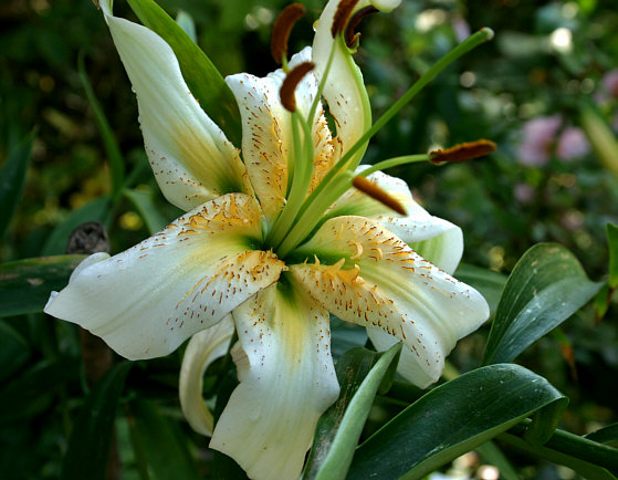 die zweite lilium speciosum var. gloriosoides hat jetzt ihre blüten geöffnet. sind schon was feines. hoffe ich kann ihr die winterzickigkeit die winwen erwähnt austreiben...muss mir was einfallen lassen, denn sie bleiben definitiv draussen