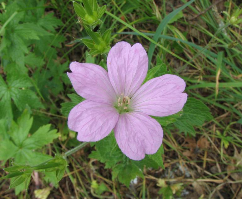 Wald-Storchschnabel Geranium sylvaticumDer mittelgroße, ausdauernde Wald-Storchschnabel blüht von Juni bis Juli mit 22 bis 26 mm großen dunkel bläulich- bis rötlichpurpurnen Blüten, die eine weiße Mitte haben. Je nördlicher man die Pflanze in Nordosteuropa antrifft, desto häufiger findet man auch Formen mit rosafarbenen oder weißen Blüten. Die anschließende Frucht hat die typische storchschnabelartige Gestalt. Die Blätter sind kräftig grün und fiederspaltig gelappt.