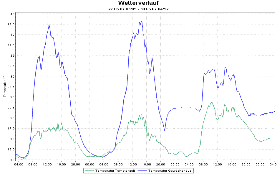 Hat jemand noch Tips ? Aktuelle Rangliste nach Gewicht: 1. Big Crimson mit 4,25 kg (20,5 cm Durchmesser)2. Wills Sugar mit 2,9 kg (17,7 cm Durchmesser)2. Blacktail Mountain mit 2,9 kg (17,7 cm Durchmesser)Alle drei sind noch lange nicht reifen und wachsen noch. ;DUnd hier nochmal ein Temperatur-Diagramm wo man ganz gut sieht, seitwann ich niedrige Temperaturen mit dem Heizlüfter "abfange"