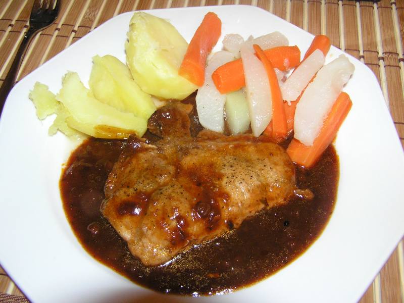 kotelett im soßensee mit salzkartoffeln und gemüse (mairübchen, karotten, kohlrabi)