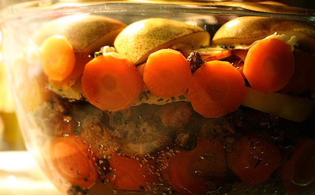 hier gabs gestern abend und auch heute mittag nochmal möhrengemüse mit birnen, ein rezept einer freundin aus niedersachsen. hab ich nach 20 jahren mal wieder gemacht, sehr lecker mit pellkartoffeln, möhren, hackfleisch und obendrauf birnenhälften....leider wure es aus dem backofen geholt und sah kurz danach so aus, als hätte jemand einen krater gegraben