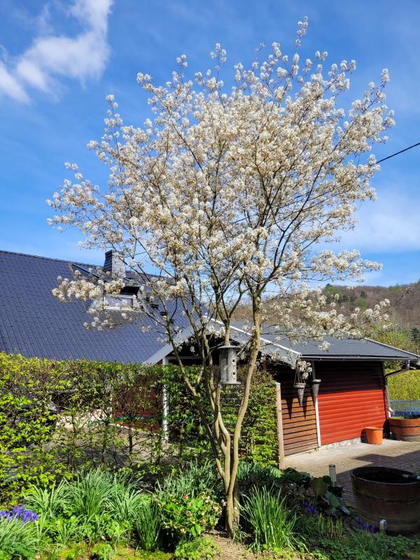Ja, die war schon da, als wir das Haus vor etwas über 11 Jahren gekauft haben. Und da war sie schon nicht mehr klein. Ich habe aber keine Ahnung, wie alt sie ist. 20-30 Jahre wohl sicherlich. Sie war rechts und links recht stark eingezwängt von anderen, ebenfalls ziemlich hohen Gewächsen. Da uns das alles viel zu viel "Mauer" war, hatten wir die weggenommen. Die Felsenbirne hat es uns mit der "Explosion" gedankt. Wir haben immer mal wieder über einen Schnitt nachgedacht, ehrlicherweise muss ich sagen, dass ich das nie wollte. Wir haben damals viele Bäume, zumeist Koniferen weggenommen. Die Felsenbirne, die sich so schön entwickelt hat, wollte ich aber nie einschränken. Ich finde die einfach zu prächtig. Und der Ertrag ist völlig ausreichend, da brauche ich nichts durch Reduzierung zu optimieren. Der Likör, den meine Frau daraus macht, schmeckt einfach traumhaft.