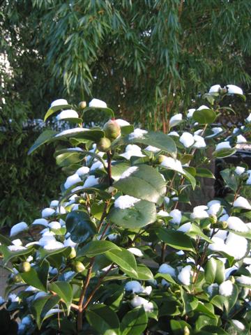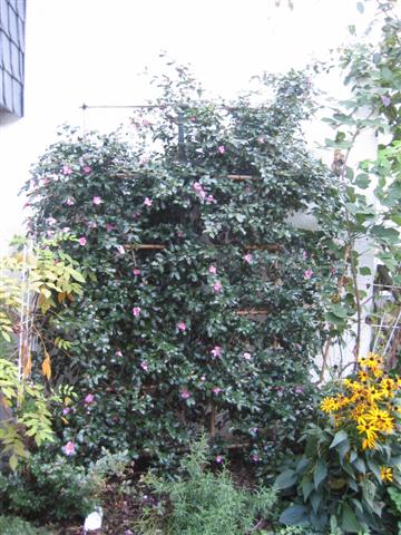 Wir haben auch eine ausgepflanzte C.sasanqua im Garten - gezogen an einem Spalier - gepflanztin einer Mauerecke, Sie bekommt dort Sonne ab ca.14Uhr bis zum Sonnenuntergang.Offensichtlichhat auch sie den Winter ohne Schäden überstanden.Die einzige Schutzmassnahme war eine Isolierung des Stammes bis 30cm Höhe.(Foto aus dem Herbst 2005)