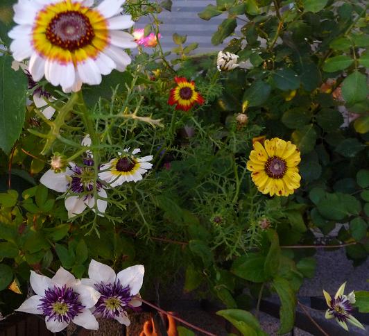 umgeben ist sie von kunterbunten Blumen aus einer Samentüte mit Mischung, weil ich die nackte Erde nimmer sehen wollte...