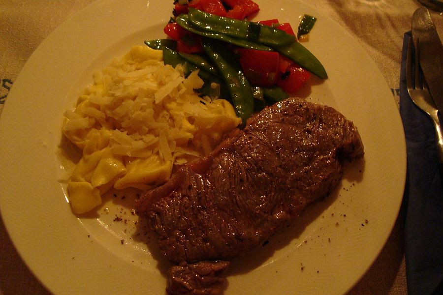 und argentinischem rumpsteak mit käse-trüffel-pasta mit grana und paprika-zuckerschote-gemüse.