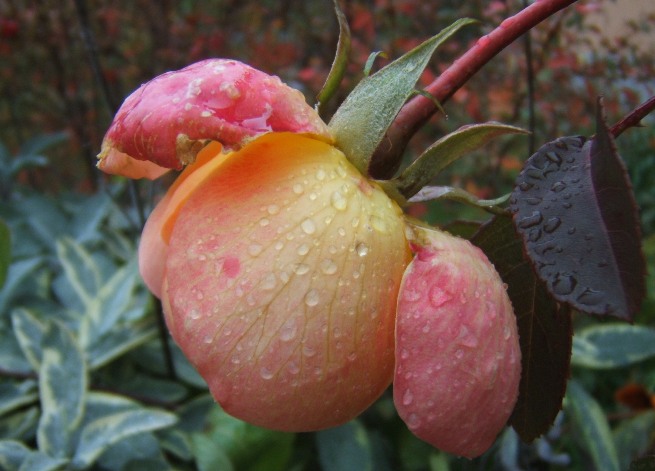 Jude the Obscure versucht noch eine seiner herbstbunten Knospen zu öffnen. In der Vase duftet noch eine Blüte.