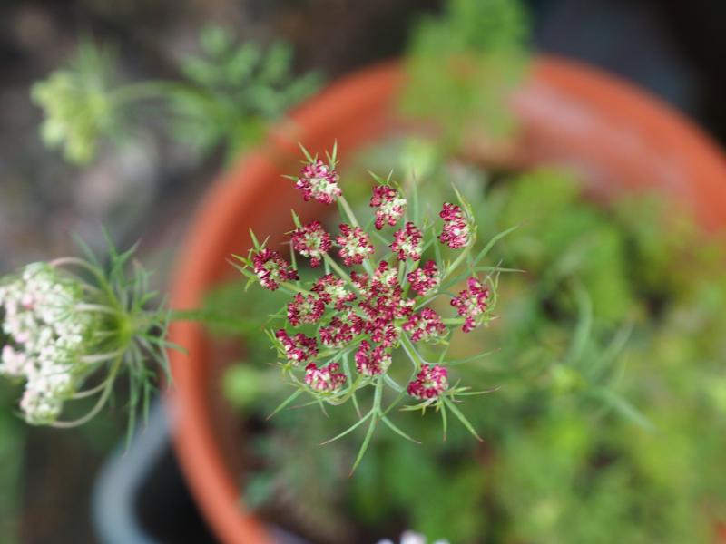 und ein weinrot blühender Sämling von Daucus carota subsp. carota.