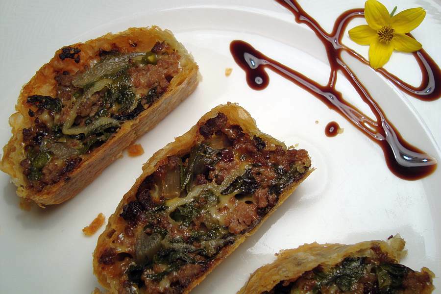 und soeben gerade ein nachthupferl: orientalisch inspirierte mangold-hackfleisch-rolle: blätterteig, hackfleisch, knoblauch, salz, schwarzer pfeffer, kreuzkümmel, mangold, pistazien, etwas käse...