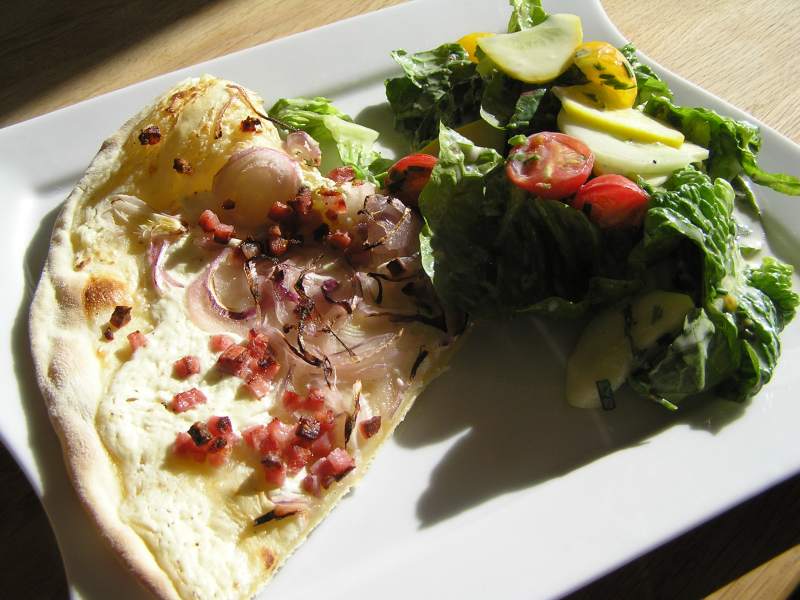 hier gabs flammkuchen vom pizzastein und gartensalat mit tomatenhälften, zucchini und gurkenscheibchen und vielen kräutern