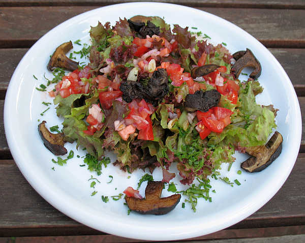 Heute gab es zuerst einen Lollo Rosso (eigene Ernte) mit den gestern gesammelten Nicht-Pfifferlingen...