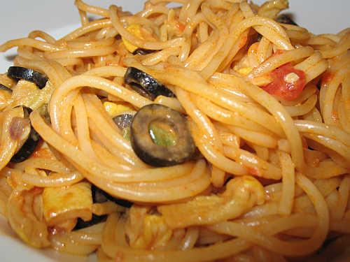 ... und dann Spaghetti mit getrockneten Zucchini und Oliven, gezogen in einem Sud aus Brühe, Wein, viel Knoblauch und ein wenig Schmelzkäse.