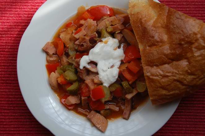 Heute gab es Wurtssoljanka (verschiedene Wurst- und Schinkenstücke, Sauerkraut, Paprika, Knoblauch,...), für mich mit Fladenbrot, für die Kinder mit Kartoffeln.