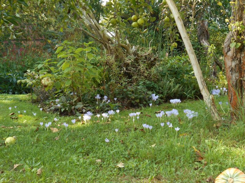 Im Frühjahr Krokusse, Glöckchen, Hyazinthen, Camassia, Margeriten, Glockenblumen, ... und im Herbst jetzt Colchicum und die vieeelen Herbstkrokusse. :)