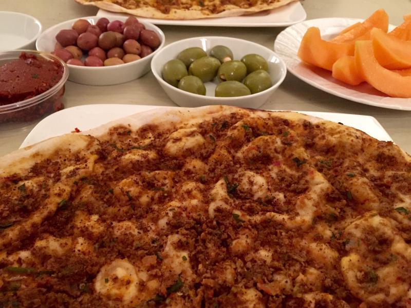 bei uns mediterran-orientalisches fast food: lahmacun, cemen, zweierlei oliven und melone (wohl eine kreuzung aus galia und charentais)nicht im bild: schafskäse mit zitronenzesten und minze sowie sumak und zitronensaft für dendiedas lahmacun