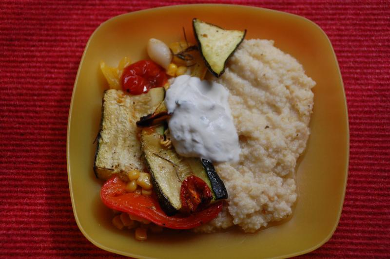 ), Mais, Knoblauch, Tomate, Gewürze, Rosmarin) mit Hirse und Yoghurt-Minze-Soße (Yoghurt, Minze, Salz, Pfeffer, Olivenöl, Zucker).