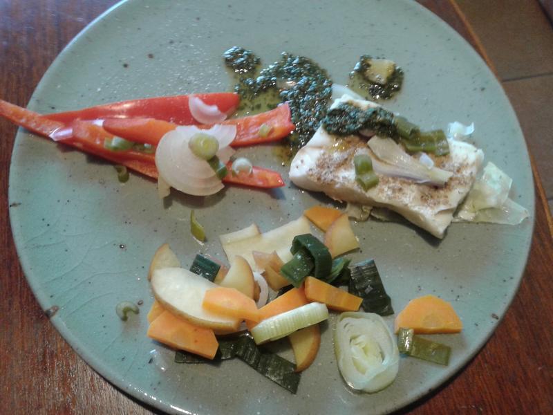 ;)heute gab es Seelachsfilet auf Spitzkohlblattt, dazu Apfel-Porree-Karottengemüse, rote paprikastreifen und dazu grüne Mojo Sauce