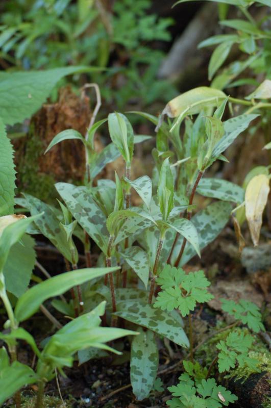 Gehören zwar meiner Meinung nach nicht wirklich zu den Schattenstauden, eher zu denen die im Sommer Kühle bevorzugen:Tricyrtis affinis mit tollem Laub.